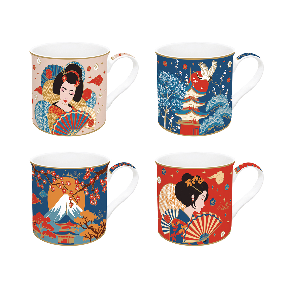 Set coordintao di quattro tazze in porcellana con decorazioni orientali, perfette per condividere un the pomeridiano in perfetto stile giapponese.