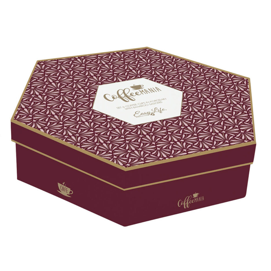 Set 6 tazzine espresso in porcellana con piattini in bamboo 110ml in scatola regalo DAMASK